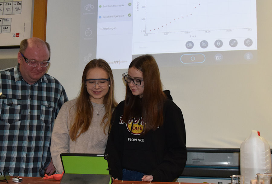 (Schülerinnen diskutieren mit ihrem Chemielehrer die mit dem iPad über spezielle Sensoren aufgenommene Titrationskurve)